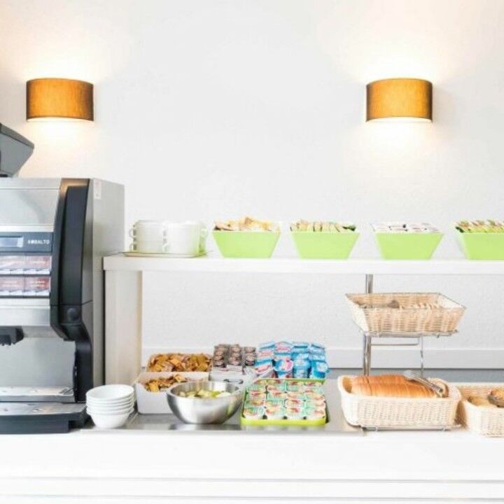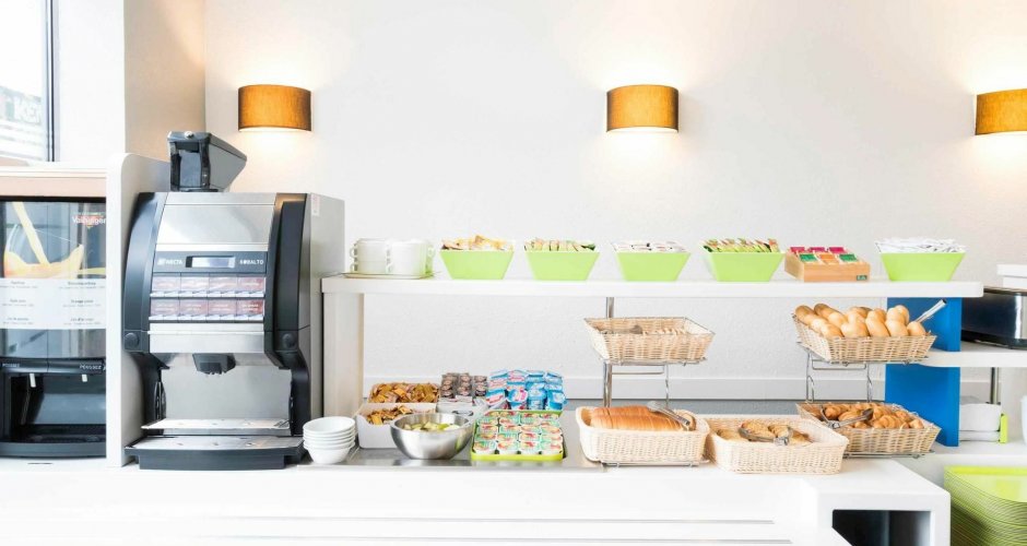 ganz moderner Raum für ca. 120 Personen im Erdgeschoss. Es wird ein verstärktes, französisches Frühstück in Form eines Büffets mit Cakes, Baguette, Brötchen, Konfitüre, Müsli, Cornflakes, Joghurt, Weichkäse, Apfelkompott, Fruchtsäften und warmen Getränken ab 6.30Uhr – 10Uhr serviert